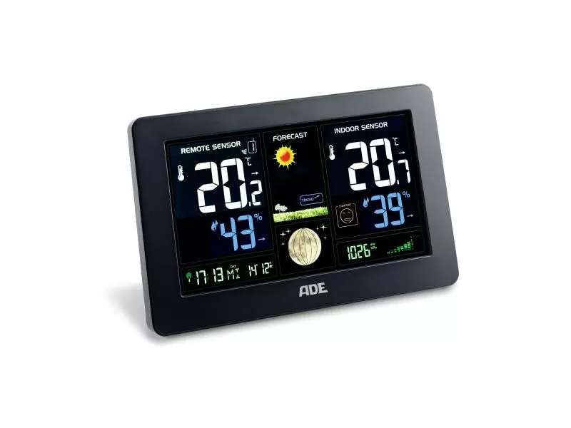 Die Wetterstation mit Funkaussensensor von ADE bietet Ihnen eine animierte Wettervorhersage mit Trendanzeige, sodass Sie immer wissen, ob eine Jacke oder ein Schirm nötig ist. Das Gerät informiert Sie zudem über die Innen- und Aussentemperatur sowie Luftfeuchtigkeit, den Luftdruck und die Mondphasen. Ausserdem sehen Sie auf dem Display das Datum und die Uhrzeit. Die Ober- und Untergrenze der Temperatur ist programmierbar. Bei einer zu hohen oder niedrigen Aussentemperatur ertönt ein Alarm.