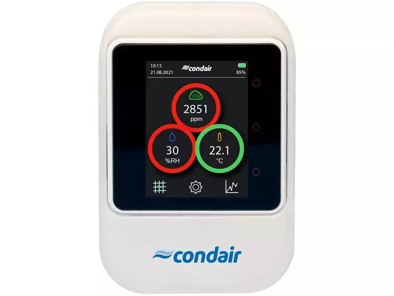 Dank hochqualitativer Sensoren misst der Condair Cube schnell und präzise die Luftqualität – und das überall: Ob nun zu Hause, am Arbeitsplatz, im Restaurant, im Gym, in der Schule oder unterwegs wie im Zug, Bus, Flugzeug oder im Auto. Er hilft Ihnen dabei, das Leben in öffentlichen Räumen sicherer und besser zu gestalten. Dabei genügt ein Blick zur Überwachung des Innenraums. Sie beobachten lediglich die Ampelfarben, stellen so den IST-Zustand rasch fest und können bereits bei gelb entsprechend Handeln und den werten mit dem Öffnen eines Fensters entgegenwirken. So senken Sie nicht nur den CO2-Gehalt im Raum – und folglich auch die Aerosolkonzentration – sondern erlangen auch besseren Schutz vor Krankheitserregern. Nicht umsonst basiert das Ampelsystem des Condair Cube auf Richtwerten von internationalen, wissenschaftlichen Erkenntnissen namhafter Universitäten und Richtlinien.
