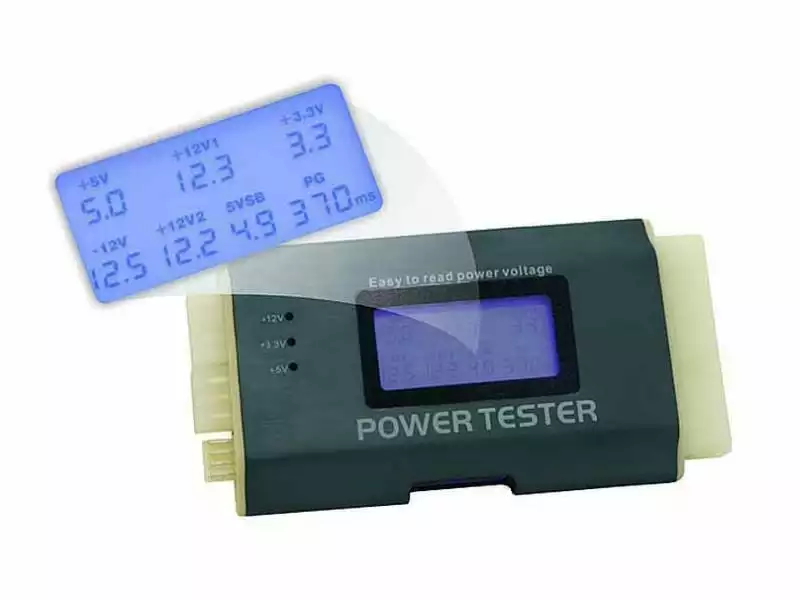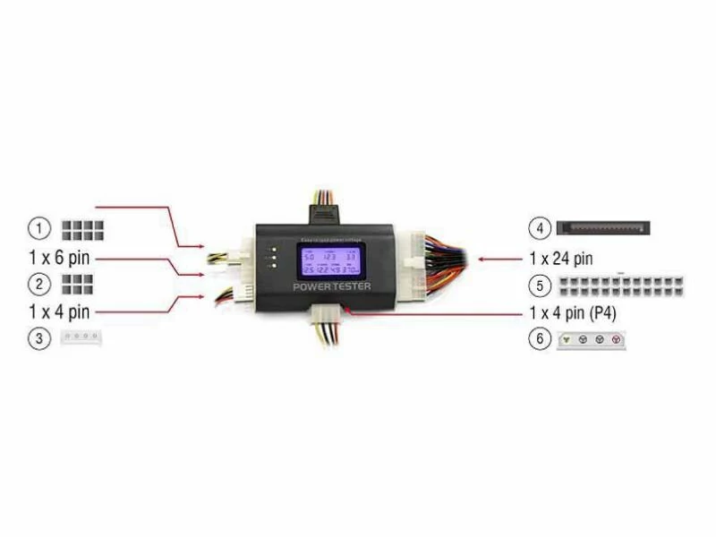 Der Delock Netzteiltester ist ein robuster Spannungstester für PC-Netzteile. Es lassen sich alle ATX-, BTX- und ITX- konforme Netzteile testen. Das veleuchtete LC-Display zeigt alle Versorgungsspannungen mit einer Nachkommastelle an. Fehler quittiert es mit einem Warnton. Der Netzteiltester eignet sich sowohl für den ambitionierten Hobbyanwender als auch für die schnelle Funktionsprüfung im professionellen Bereich.