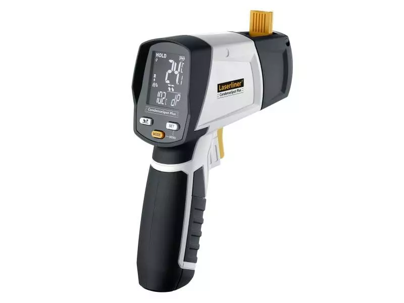 Mit dem CondenseSpot Plus von Laserliner lokalisieren Sie Wärmebrücken und Kondensationsfeuchtigkeit selbst an schlecht zugänglichen oder gefährdenden Stellen. Das Gerät verfügt ein stabiles, ergonomisches Gehäuse mit einer beleuchteten LC-Anzeige.