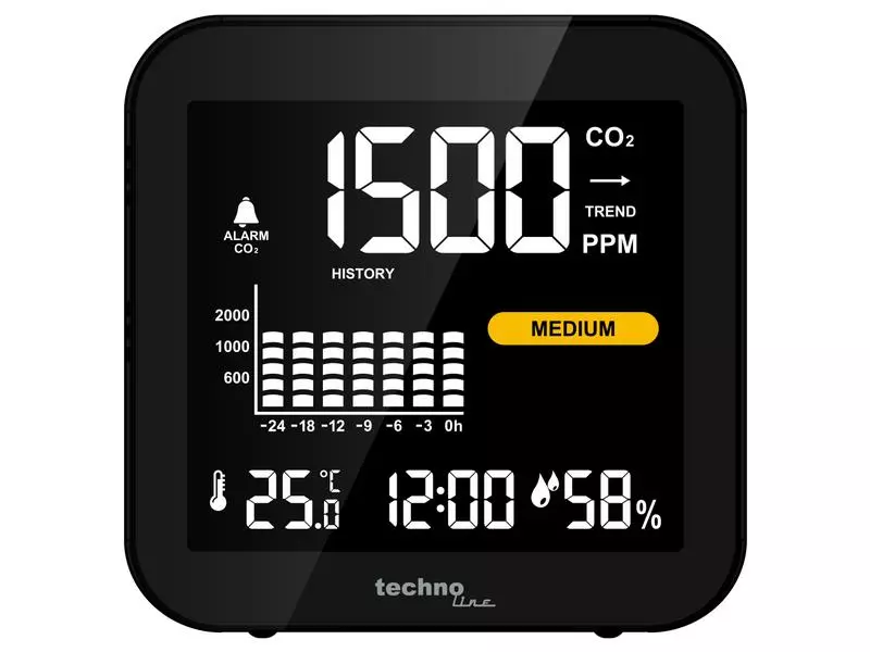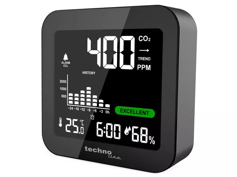 Der Luftgütemonitor 1025 misst als CO2-Messgerät die CO2-Messwerte und CO2-Trendwerte in Ihren vier Wänden und bewertet sie mittels Ampelverfärbung (EXCELLENT, GOOD, MEDIUM, POOR), damit Sie die Raumluftqualität stets im Blick behalten und entsprechende Massnahmen einleiten können. So wissen Sie immer genau, wann Sie lüften müssen. Des Weiteren zeigt er Ihnen die Innentemperatur, die Innenluftfeuchtigkeit und die Uhrzeit an.