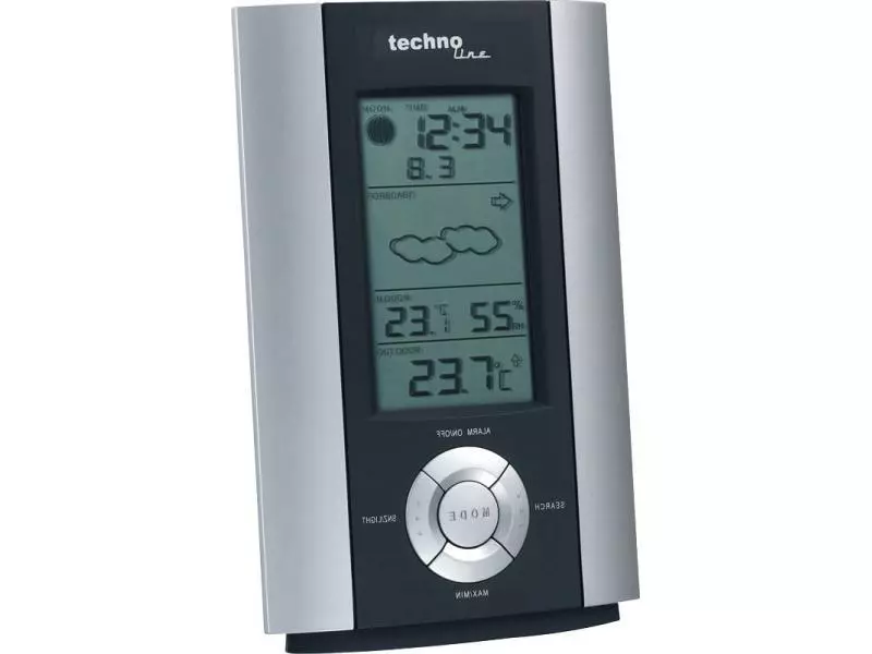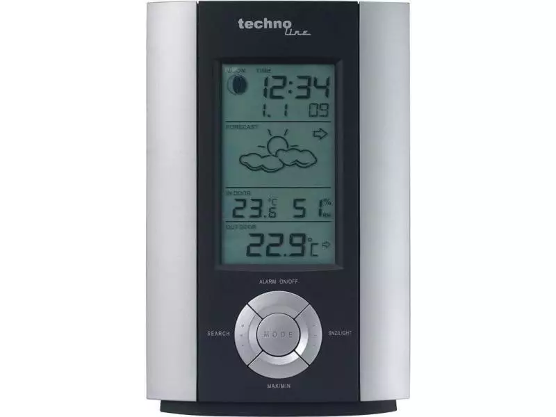 Die Wetterstation WS 6710 von Technoline hält Sie mit einer Innen- und Aussentemperaturanzeige, einer Innenluftfeuchteanzeige sowie einer Datums- und 12-/24-h-Zeitanzeige immer auf dem Laufenden. Die Übertragung zwischen Wetterstation und Aussensender erfolgt via Funk. Die Übertragungsreichweite beträgt 30 Meter. Die Station zeigt Ihnen zudem eine Vorhersage von Wettersituationen, Wettertendenzen sowie die Mondphasen an. Ausserdem erfolgt eine MIN-/MAX-Speicherung der Messwerte. Zusätzlich ist ein Weckalarm mit Schlummerfunktion integriert. Für die Stromversorgung vom Sender benötigen Sie zwei AAA-Batterien und für die Station zwei AA-Batterien, die nicht im Lieferumfang enthalten sind.