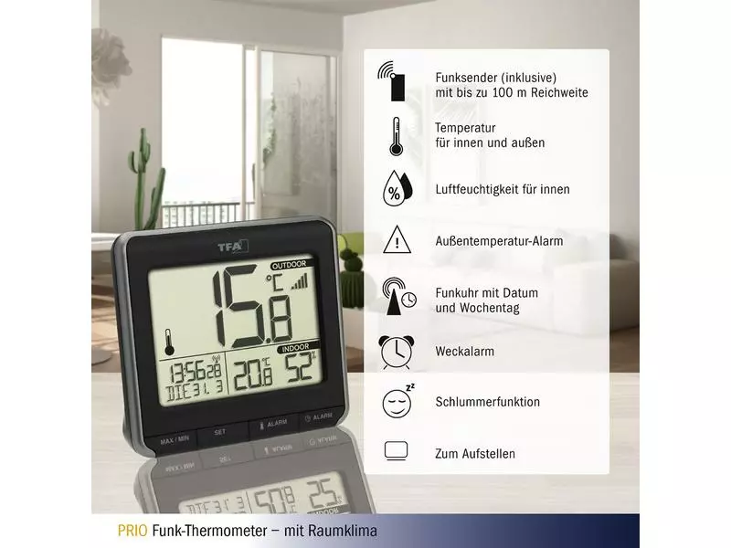 | Funktionen | Anzeige der Luftfeuchtigkeit, Höchst- und Tiefsttemperatur, Anzeige der Aussentemperatur, Anzeige der Innentemperatur |