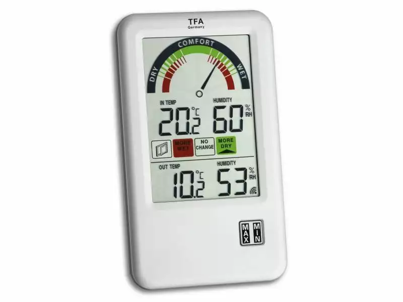 Das Display zeigt die Innentemperatur und Luftfeuchtigkeit mit farbigen Komfortzonen für ein gesundes Raumklima Zudem lassen sich Temperatur-Messbereiche aussen/innen und die Luftfeuchtigkeit aussen/innen ablesen.