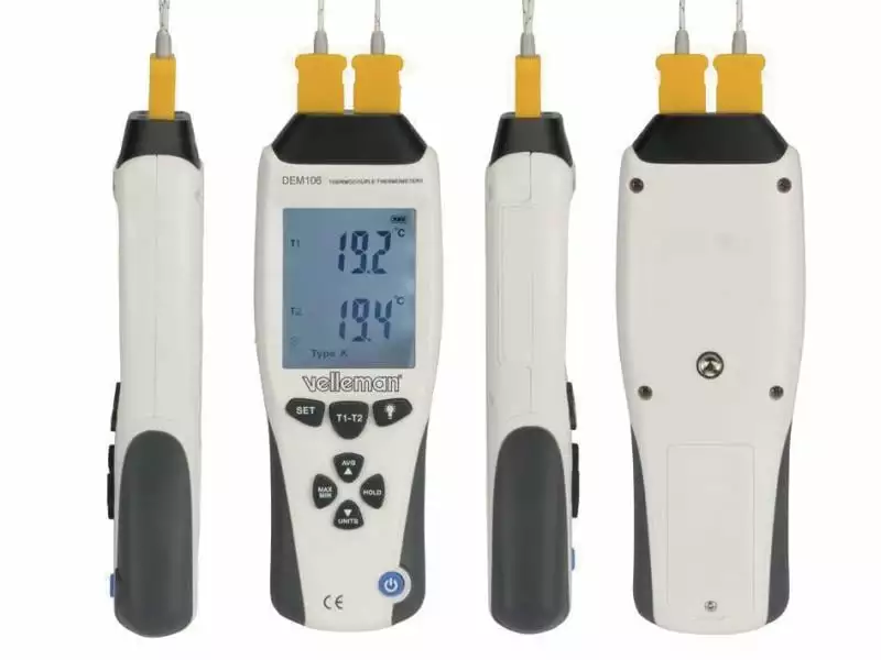Mit dem DEM106 von Velleman erhalten Sie ein digitales IR-Thermometer, das sich vor allem durch den K/J-Typ-Fühler und das vierstellige LCD-Display auszeichnet. Das Gerät verfügt über zahlreiche Extra-Funktionen, zum Beispiel für Minimum- und Maximum-Anzeigen, für Data-Hold sowie für AVG für die letzten zehn durchgeführten Messungen. Die Stromversorgung des DEM106 erfolgt über eine 9 V Batterie, die bereits im Lieferumfang enthalten ist.